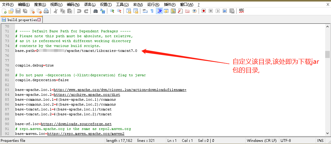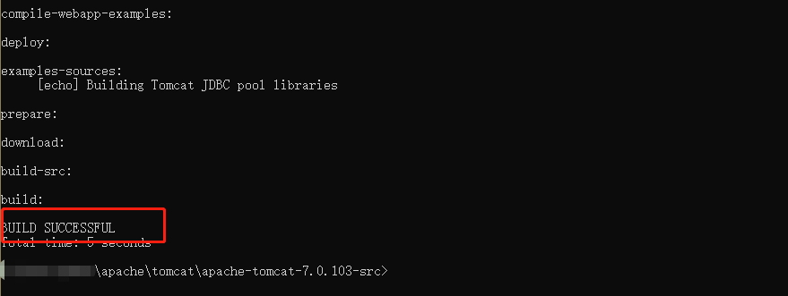 3)将下载好的tomcat源码解压(本文下载的版本为apache-tomcat-7.0.103-src.zip)4)解压后找到xxx/xxx/apache-tomcat-7.0.103-src/build.properties.default,使用文本编辑器修改文件中的base.path属性,如: base.path=D:/xxx/apache/tomcat/libraries-tomcat7.0 base.path是tomcat使用的依赖jar包,使用ant命令打包的时候会将jar包下载到该目录下.(如果你使用的是公司的内网那你需要配置代理 如: proxy.host=(你代理的ip地址);proxy.port=(代理服务器的端口);proxy.use=on)