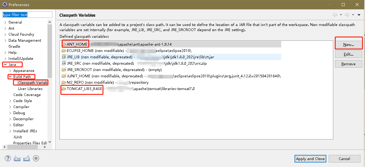 7)tomcat导入eclipse前的准备工作完成,下面就是导入把项目导入进eclipse,建议使用新版eclipse,新建work工作目录调整jdk,添加jdk1.6-jdk1.7-jdk1.8,并在eclipse依次选择Windows->Preferences->Java->Build Path->Classpath Variables-添加两个变量分别是ANT_HOME指向ant安装目录(可以看到bin的目录),TOMCAT_LIBS_BASE指向在.build.properties文件配置的base.path的路径.